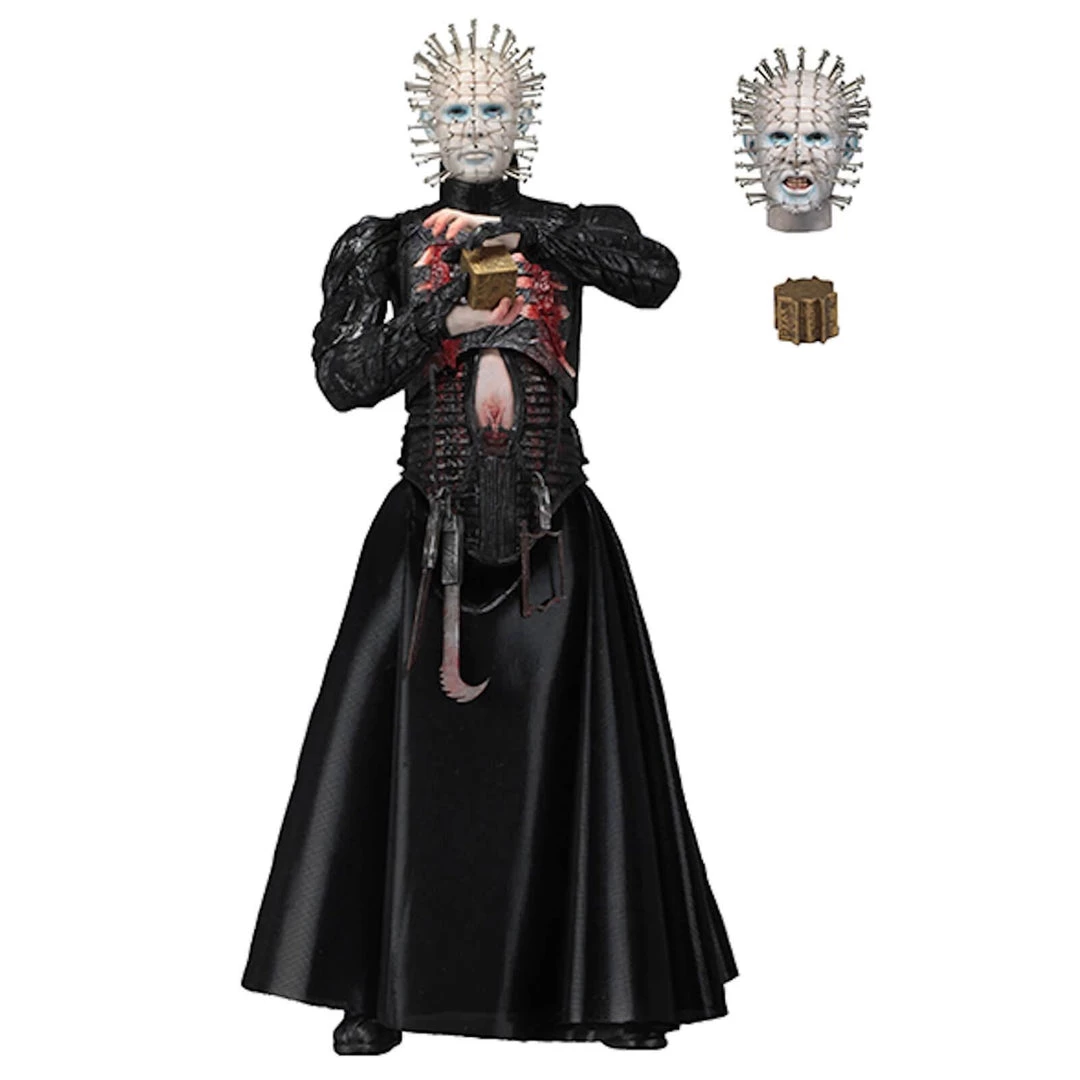Clive Barker’s grisly horror masterpiece returns to NECA! The leader of the Cenobites himself is the latest addition to the Ultimates line. Pinhead features an all-new sculpt and tons of nightmarish detail, from the pins in his head to the tools of torture dangling over the soft goods vinyl skirt. The figure comes with 2 interchangeable heads and the both open and closed Lament Configuration puzzle boxes. Display-friendly window box with opening flap.