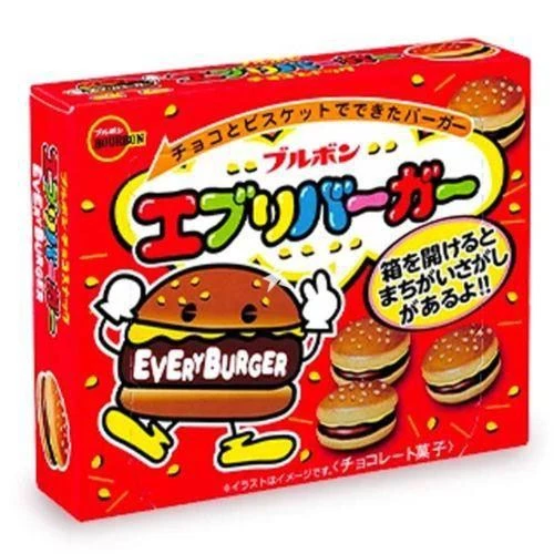 Delicious, crunchy cookies, shaped like adorable mini cheeseburgers. Filled with white and milk chocolate and topped with crispy puffs resembling sesame seeds. 66g box Contains approx 10 pieces Ingredients: Wheat flour (domestic production), sugar, cacao mass, whole milk powder, vegetable oil, shortening, margarine (including milk components), lactose, butter, cocoa butter, skim milk powder, sweetened condensed milk, whole egg, glutinous puff, sesame, Lactose, salt, dried egg white (including eggs) / Ca phosphate, emulsifier (derived from soybeans), swelling agent, fragrance (derived from milk), coloring agent (carotenoid), vitamin D Allergens: Milk, eggs, wheat, sesame, soybeans
