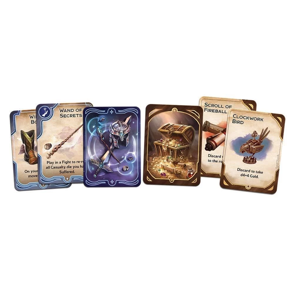 Rumors of a hidden vault of gold circulate through the streets, taverns, and markets of Waterdeep. In the Vault of Dragons each player chooses one of the four unsavory factions racing to locate the secret of the vault! Sinister criminals, devilish nobles, mercenary drow and mysterious wizards are all competing to be the first to find the Vault of Dragons! Send your followers to locations in and around Waterdeep to search for rumors and treasure. Explore the dungeons of Undermountain to find the secret of Vault of Dragons. Double-sided locations and dungeons give you more locations to explore! But beware of the City Watch, and be ready to brawl with other factions to control key locations. Box Contents:6 Dungeons12 Location Tiles1 Yawning Portal Tile50 Treasure Cards50 Magic Item Cards4 Faction Cards40 Plastic Figures17 Dice157 Tokens1 Rulebook