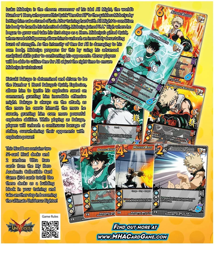 This Rival Box contains two 51 card starter decks and 2 random Ultra Rares from the My Hero Academia CCG. Izuku Midoriya and Katsuko Bakugo face off in this explosive 104 card beginners set for the My Hero Academia Collectible Card Game! Each deck is ready to play right out of the box but can also be expanded with cards from the My Hero Academia CCG booster packs. These decks also include exclusive cards not found in the Series 1 booster packs! Contains: 2 x 51 Card Starter Decks, 2 x Random Ultra Rares 2 x Ultra Rare cards to give the player a preview of what to expect from the main set
