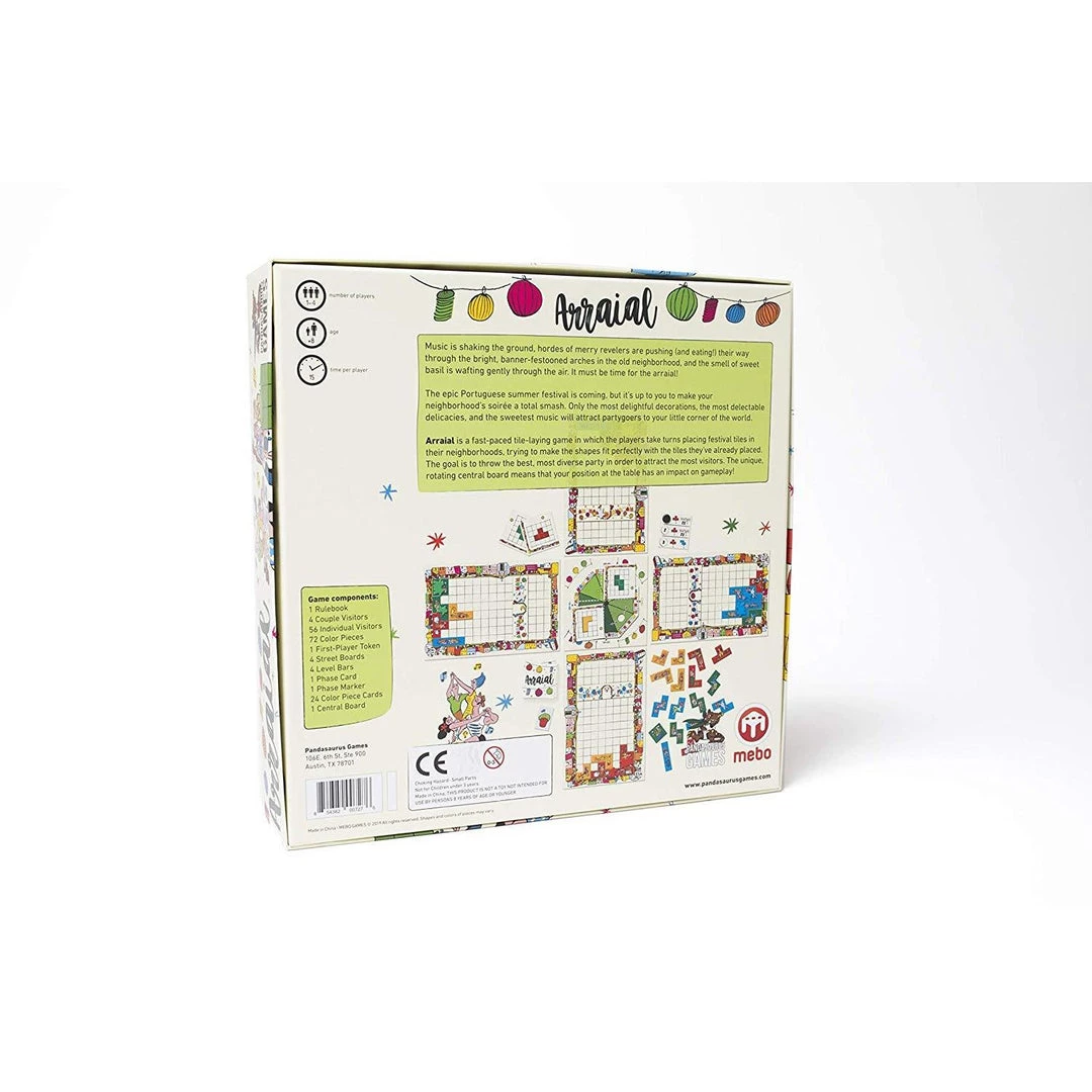“Arraial” is the name given to traditional Portuguese summer celebrations during which people take to the streets eating, drinking, and having fun in the old neighbourhoods that are bedecked with arches, colourful balloons, popular music, and the aroma of sweet basil. In the game Arraial, players try to make their neighbourhood traditional event the most popular by attracting visitors to their celebration. Grab the most beautiful decorations, hire the most inspired performers, serve the most traditional delicacies, take to the streets, and host the party of the year! Arraial is a fast-paced game in which players take turns spending action points to get the best tiles (decorations, artists…) and place them on their player boards to form the perfect match and attract visitors to their party. In the end, whoever attracts the most visitors in their neighborhood wins.