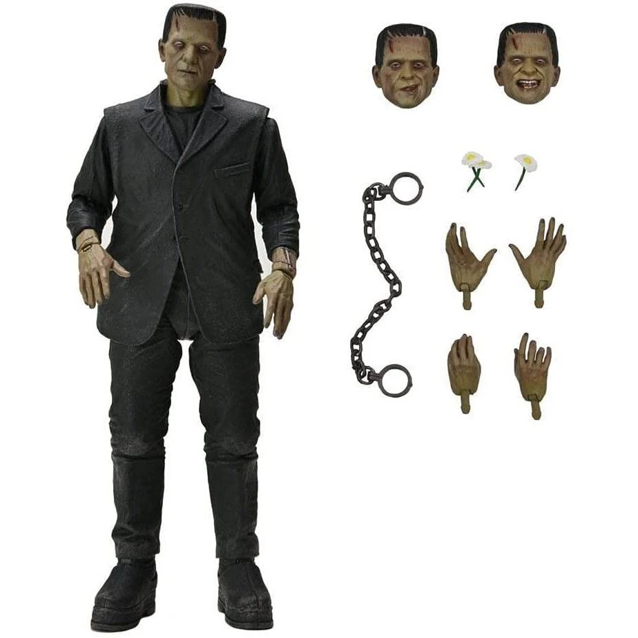 To celebrate the 90th anniversary of the acclaimed silver-screen classic Frankenstein, NECA announces the triumphant debut of Universal Monsters in its Ultimate action figure line! The sculpt captures Boris Karloff’s poignant portrayal of the misunderstood monster in color. Standing in 7” scale, the figure comes in premium anniversary packaging with plenty of accessories: 3 interchangeable heads, 6 interchangeable hands, shackles and daisies.